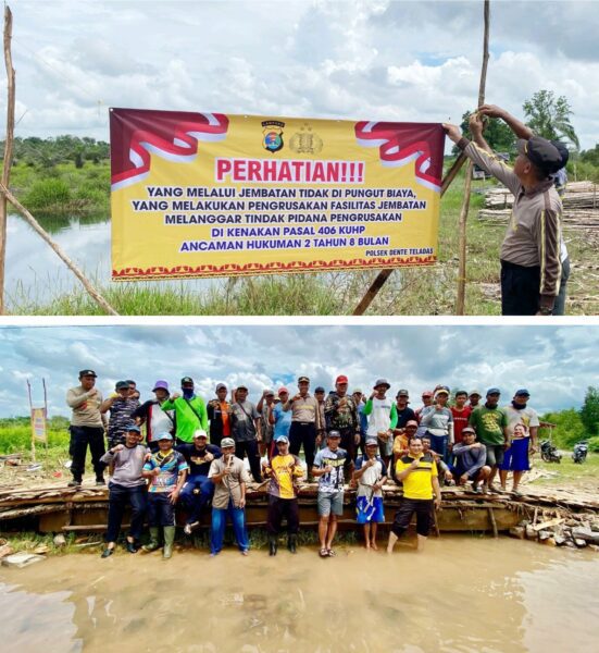 Perwiraone.com Tuba – Polsek Dente Teladas, Polres Tulang Bawang, Polda Lampung, bersama warga bergotong royong membangun jembatan penyeberangan guna mencegah terjadinya aksi pungutan liar (pungli) oleh oknum yang tidak bertanggung jawab.