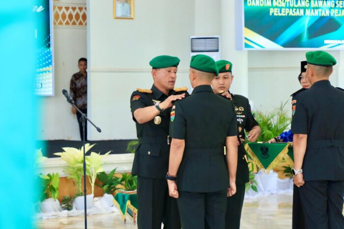 Perwiraone.com Tulang Bawang, – Komandan Korem 043/Garuda Hitam (Gatam) Brigjen TNI Haryantana, S.H., memimpin acara tradisi penerimaan warga baru dan pelepasan pejabat lama Kodim 0426/Tulang Bawang, yang digelar di Gedung Serba Guna (GSG) Pemerintah Daerah Kabupaten Tulang Bawang, Jumat (31/10/2025).