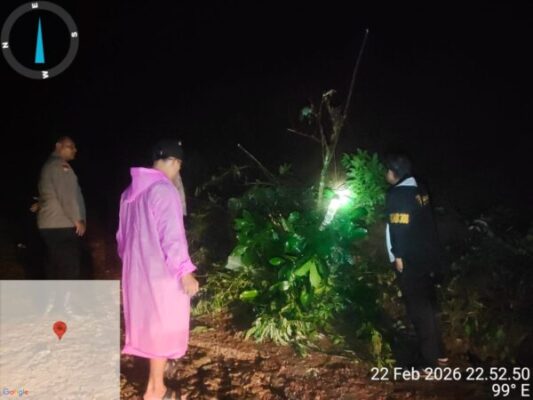 Perwiraone.com Tanggamus – Meski dalam kondisi gelap dan diguyur hujan, jajaran Polsek Pulau Panggung bersama Kepala Pekon (Kakon) Sinar Jawa bergerak cepat meninjau sekaligus mengevakuasi material longsor di Jalan Poros Pekon Sinar Jawa menuju Kecamatan Air Naningan, Kabupaten Tanggamus, Minggu malam (22/2/2026) sekitar pukul 23.00 WIB.