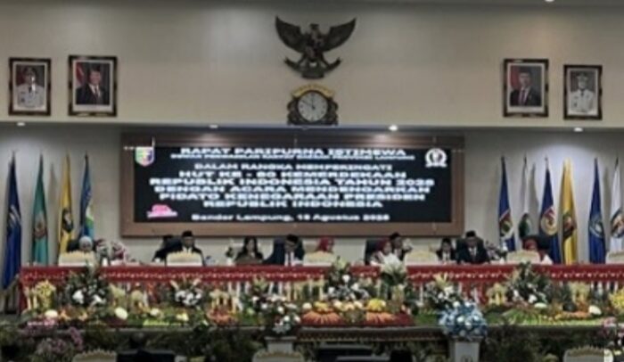 Perwiraone.com Lampung – Gubernur Lampung Rahmat Mirzani Djausal, Wakil Gubernur Jihan Nurlela, unsur Forkopimda Provinsi Lampung, pimpinan dan anggota DPRD Provinsi Lampung, mengikuti Rapat Paripurna Istimewa DPRD Provinsi Lampung mendengarkan Pidato Kenegaraan Presiden Prabowo Subianto dalam rangka Hari Ulang Tahun (HUT) RI ke- 80, secara virtual, di Ruang Sidang DPRD Provinsi Lampung pada Jumat 15 Agustus 2025.