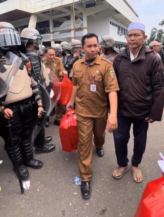 Kehadiran pegawai Pemprov dengan plastik merah berisi camilan seakan menjadi jeda yang menyejukkan di tengah dinamika aksi. Serba-serbi kecil ini membuktikan bahwa unjuk rasa tidak selalu identik dengan ketegangan, melainkan juga bisa memunculkan sisi humanis yang menghangatkan suasana.