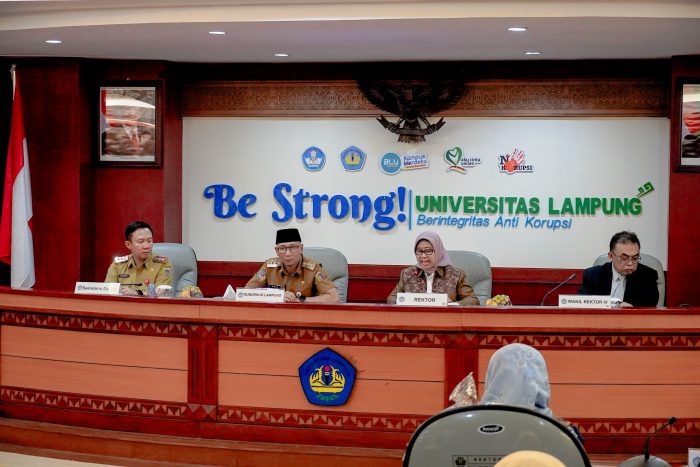 Bandar Lampung, 21 Juli 2025 – Pemerintah Provinsi Lampung dan Universitas Lampung (Unila) resmi menjalin kolaborasi strategis demi mendorong kemajuan daerah berbasis ilmu pengetahuan. Komitmen ini ditandai dengan penandatanganan Nota Kesepakatan antara Gubernur Lampung, Rahmat Mirzani Djausal, dan Rektor Unila, Lusmeilia Afriani, di Gedung Rektorat Unila.
