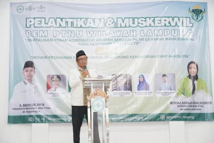Perwiraone.com Lampung – Gubernur Lampung yang diwakili oleh Kepala Dinas Komunikasi, Informatika, dan Statistik Provinsi Lampung, Ganjar Jationo, menghadiri Pelantikan dan Musyawarah Kerja Wilayah Badan Eksekutif Mahasiswa (BEM) Perguruan Tinggi Nahdlatul Ulama (PTNU) Wilayah Lampung. Acara ini berlangsung di Gedung Serba Guna Universitas An Nur, Lampung Selatan, Jumat (05/09/2025).