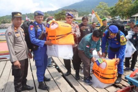Tampak anggota PPS bersama personel Sat Polair, Polsek Kalianda, dan Koramil Kalianda membawa logistik menuju kapal. Pengawalan dilakukan untuk memastikan proses distribusi berjalan lancar tanpa gangguan.