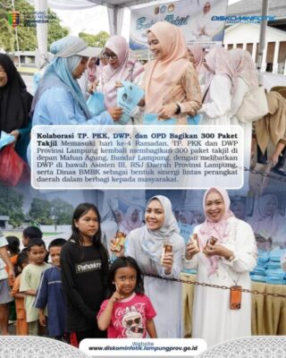 Perwiraone.com Lampung – Tim Penggerak PKK Provinsi Lampung bersama Dharma Wanita Persatuan (DWP) Provinsi Lampung kembali melaksanakan kegiatan berbagi takjil di depan Mahan Agung, Bandar Lampung, Jumat (27/02/2026), memasuki hari ke-4 Ramadan 1447 H. Kegiatan ini menjadi bagian dari agenda rutin sebagai wujud kepedulian sosial kepada masyarakat yang menjalankan ibadah puasa.